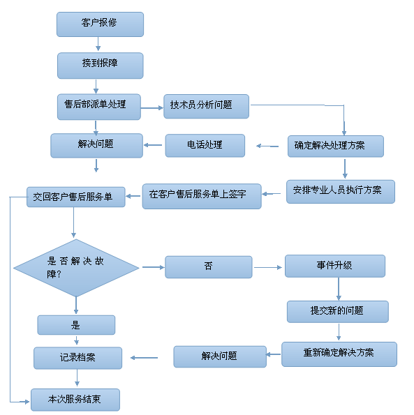 自投標產品終驗合格開始算起年內硬件全免費保修(人為損壞除外)軟件提供免費升級及終生售后服務,產品設計與質量問題免費更換與升級,系統故障時,我方提供服務、分析事故原因,如因系統設備本身原因,一切費用由我方支付(人工費、材料費、差旅費均由本企業承擔)。